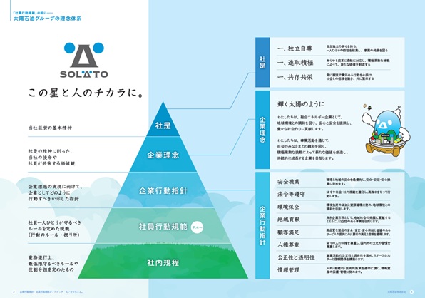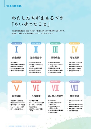 また、社員行動規範が記載されたガイドブックと携帯カードを作成し、全社員に配布することで内容の周知を図るとともに、不明な点があればいつでも確認できる体制を整備しています。