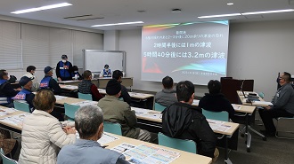 今回は、「菊間地区の地震災害について」というテーマで研修会を開催し、南海トラフ巨大地震が発生した際の菊間地区における被害想定や日頃からの備えについて、地域にお住いの方々に向け防災意識の高揚を図りました。