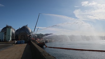 ・訓練に用いた放水車(陸上・海上)の一斉放水