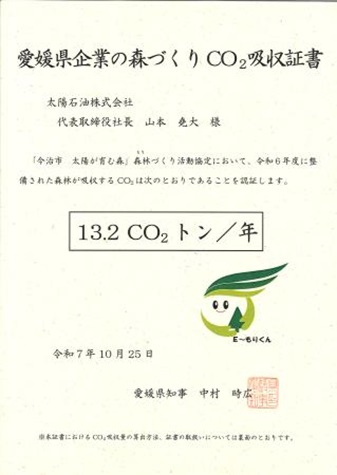 当社は、環境保全活動の一環として2007年度より、愛媛県・今治市・当社の三者で「今治市 太陽が育む森 森林づくり活動協定」を締結し、自治体の森林整備の支援を行っており、当協定に基づき2024年度中に整備を行った森林が吸収した二酸化炭素量として、愛媛県から13.2 CO2トン/年の認証をいただいたものです。