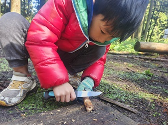 午前中は木笛づくりに挑戦。ナイフを使って空気の抜け穴を作ったり、音が鳴るように調整したりする繊細な作業に、真剣な表情で取り組んでいました。