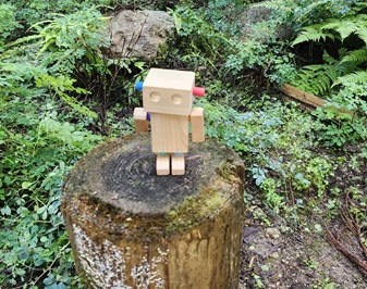午後からは手作りの木笛を持ってグループに分かれて森の中を探検。道中の各所にシグナル(木のロボット)を設置し、シグナルを見つけたグループは木笛を吹き、笛の音が聞こえたグループはそれに応えるように笛で返事をするという決め事をして出発。