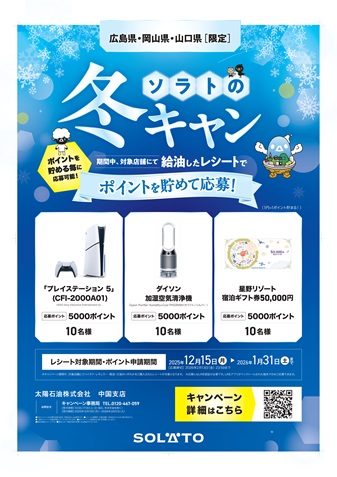 当社は、下記の通り、2025年12月15日(月)より中国エリア対象のSOLATO SSにて冬期燃料油キャンペーンを開催することといたしました。