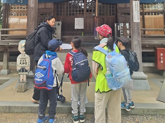 チェックポイントのお寺で参拝する子どもたち