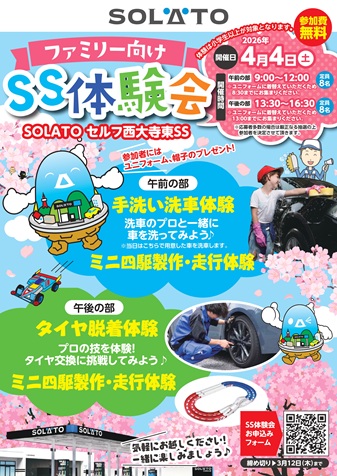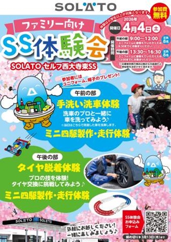 当社中国支店では、2026年4月4日(土)に岡山市所在のセルフ西大寺東SSにて抽選で選ばれた方を対象としたファミリー向けSS体験会を開催する事といたします。